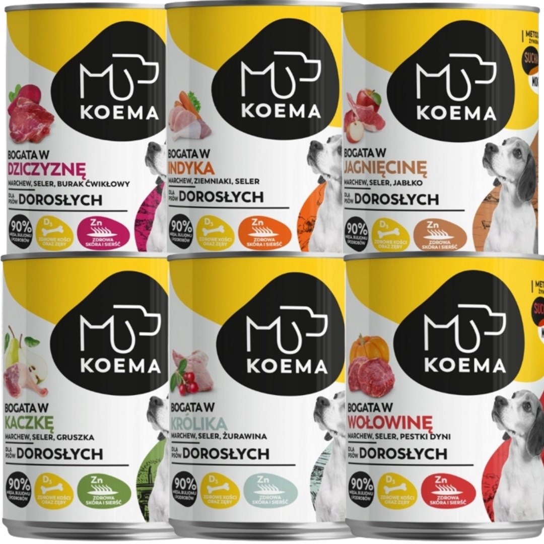 Koema karma dla psa 90% mięsa mix 6 smaków 400g x 6 (dziczyzna, jagnięcina, wołowina, królik, indyk, kaczka)