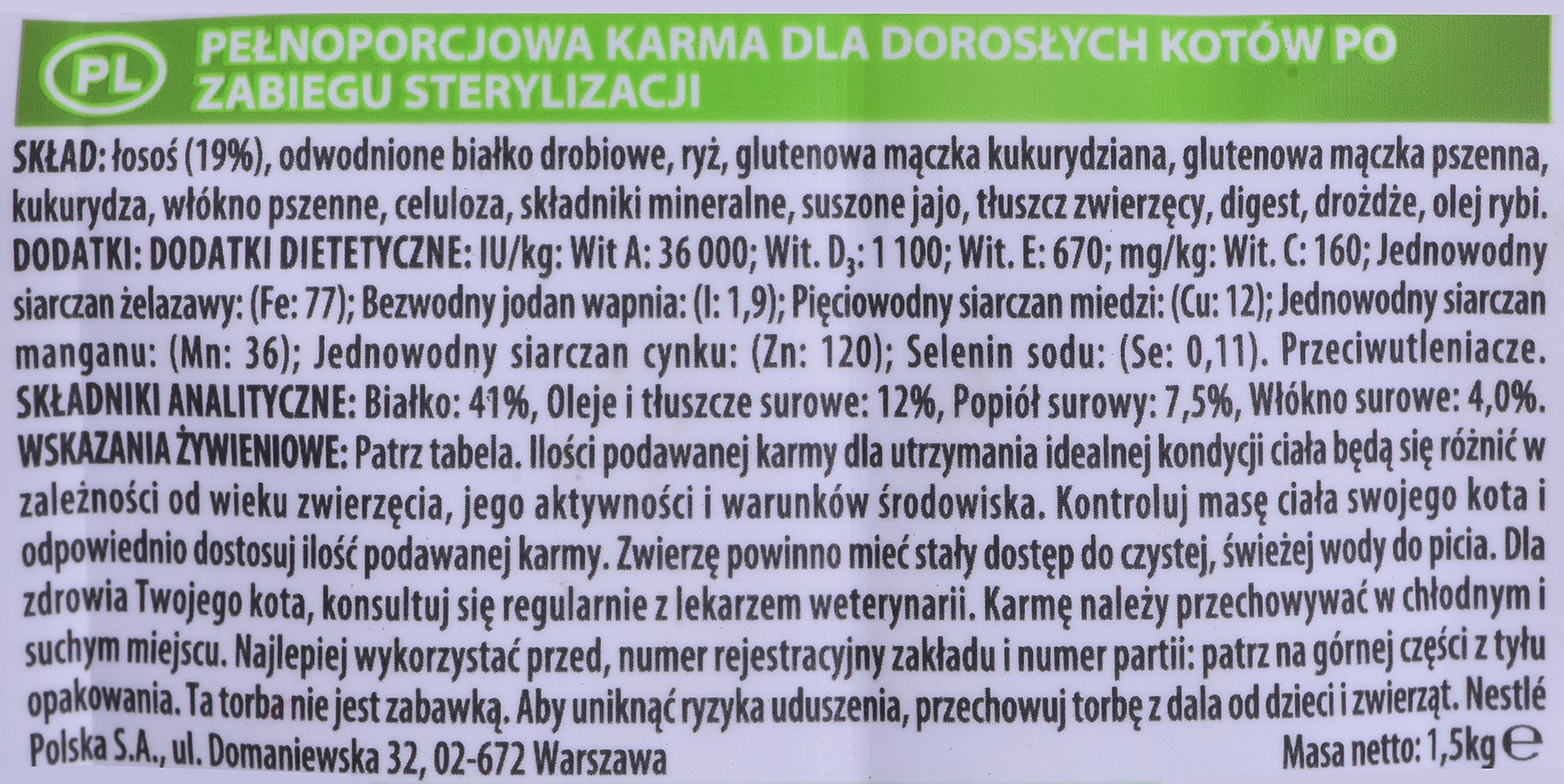 PURINA PRO PLAN STERILISED OPTIRENAL with salmon - sucha karma dla kotów sterylizowanych z problemami urologicznymi - 1,5kg