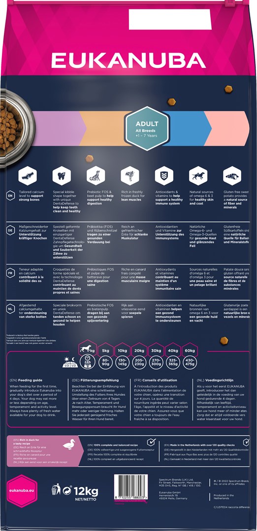 Skład świeżo mrożona kaczka (19%), suszony kurczak i indyk (19% w tym kurczak 11%, naturalne źródło glukozaminy, chondroityny i tauryny), ziemniak, zielony groszek, batat (13%), tłuszcz drobiowy, suszone wysłodki buraczane (3.5%), sos z kurczaka, suszone jaja całe, minerały (zawiera heksametafosforan sodu 0,34%), suszone drożdże piwne, siemię lniane, fruktooligosacharydy (0,25%, naturalny prebiotyk).