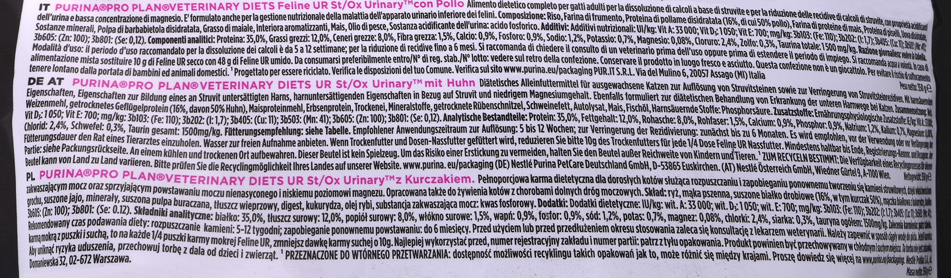 Skład ryż, mąka pszenna, suszone białko drobiowe (16 %, w tym kurczak 50 %), mączka białkowa z kukurydzy, białko grochu, suszone jajo, minerały, suszona pulpa buraczana, tłuszcz wieprzowy digest, kukurydza, olej rybi, substancja zakwaszająca mocz: kwas fosforowy