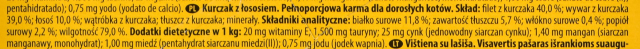 Skład KURCZAK: filet z kurczaka 40%, bulion z kurczaka 39%, kurczak (zawiera serca i wątróbkę), tłuszcz z kurczaka, minerały. KACZKA: filet z kurczaka 40%, bulion z kurczaka 39%, serca z kaczki 10%, wątróbka z kurczaka, tłuszcz z kurczaka, minerały. ŁOSOŚ: filet z kurczaka 40%, bulion z kurczaka 39%, łosoś 10%, wątróbka z kurczaka, tłuszcz z kurczaka, minerały